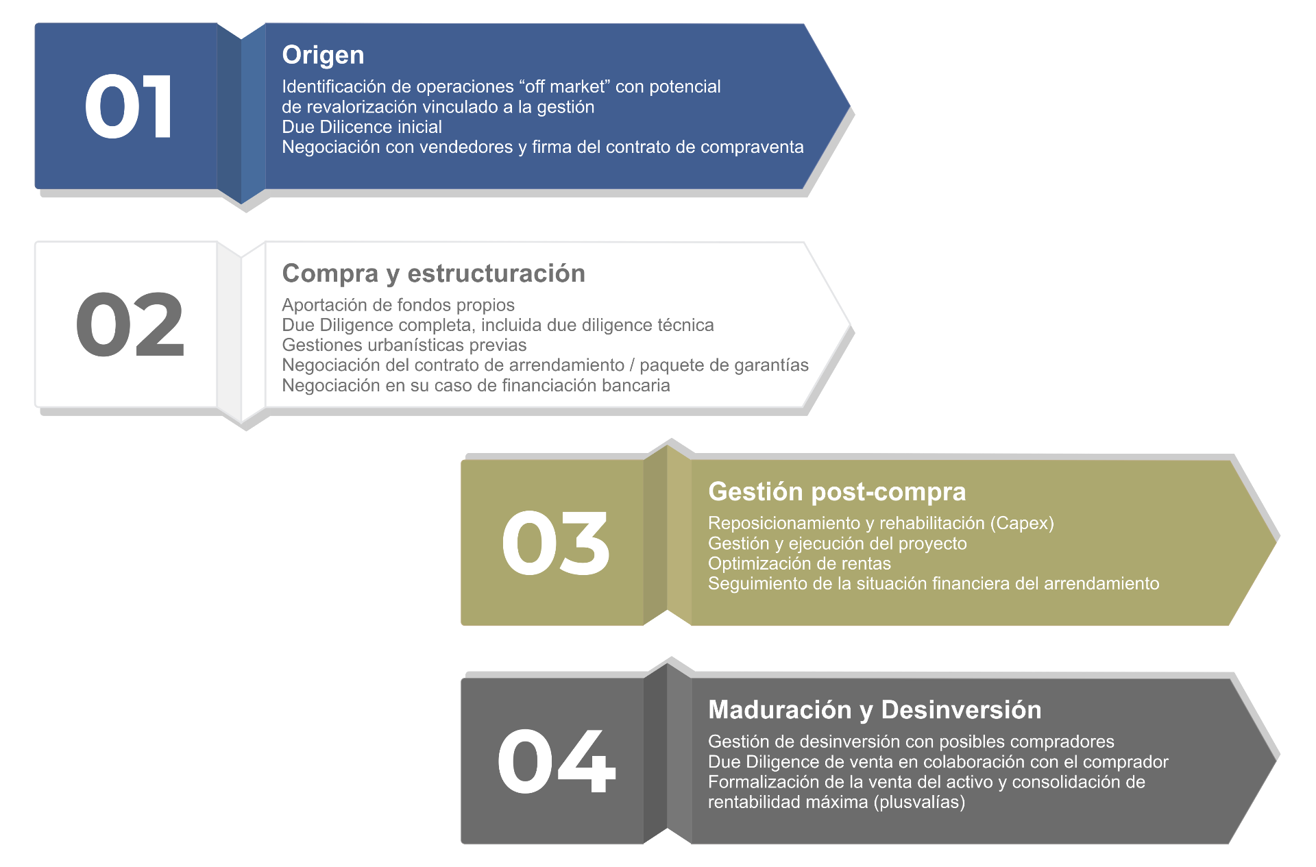 Nuestro proceso de creación de valor en las inversiones empieza en el momento en el que identificamos cada oportunidad, se intensifica cuando se formaliza la inversión y continúa durante toda la vida de la misma hasta la desinversión.A lo largo todo este ciclo ponemos en valor nuestras principales fortalezas: